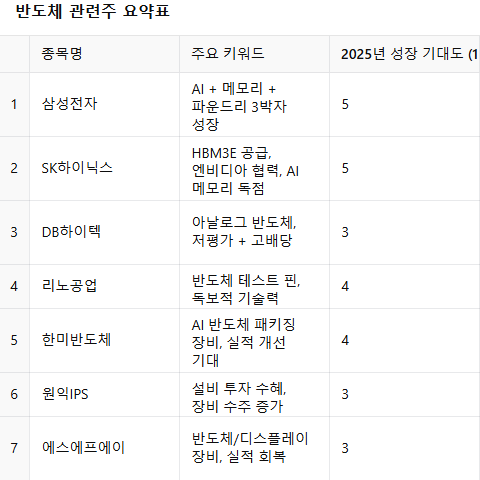 실제로 반도체 장비주(한미반도체, 원익IPS, 에스에프에이 등)들도 2025년 들어